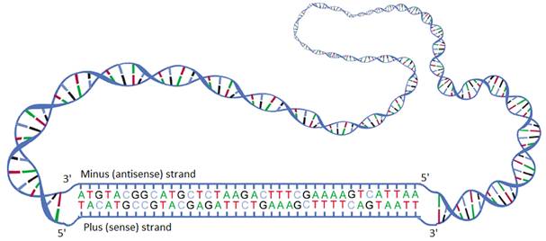 (unzip).  The minus strand is used as a template to transcribe mRNA.