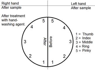 6. Now, sample the same site with your right hand, but only one fingertip at a time. Then rub that fingertip in the hand-cleansing agent in your left palm for 10 seconds (follow the directions on the bottle whether you need to air dry or rinse with water and dry).