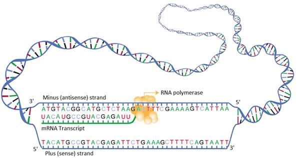 (unzip). The minus strand is used as a template to transcribe mRNA.
